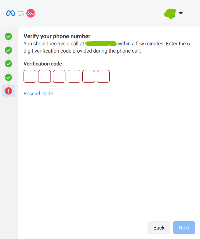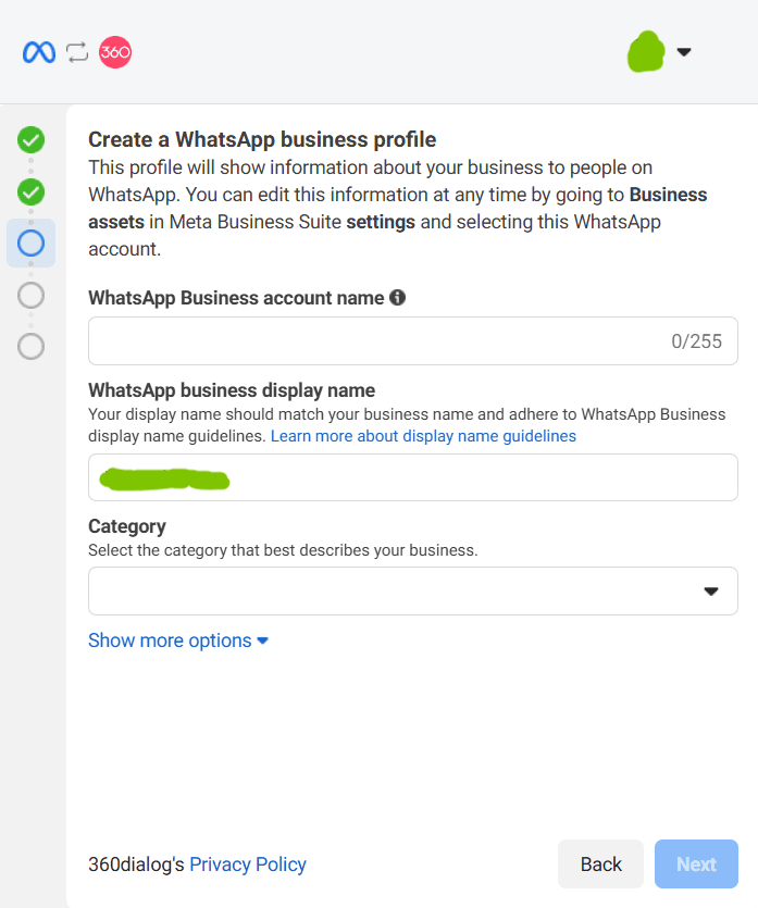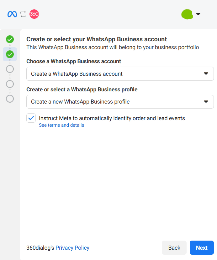 9. Seleziona con quale profilo continuare e collega il tuoi account 360dialog, dopo potrai associare un portfolio business esistente o crearne uno nuovo per aggiungere il tuo numero di telefono: