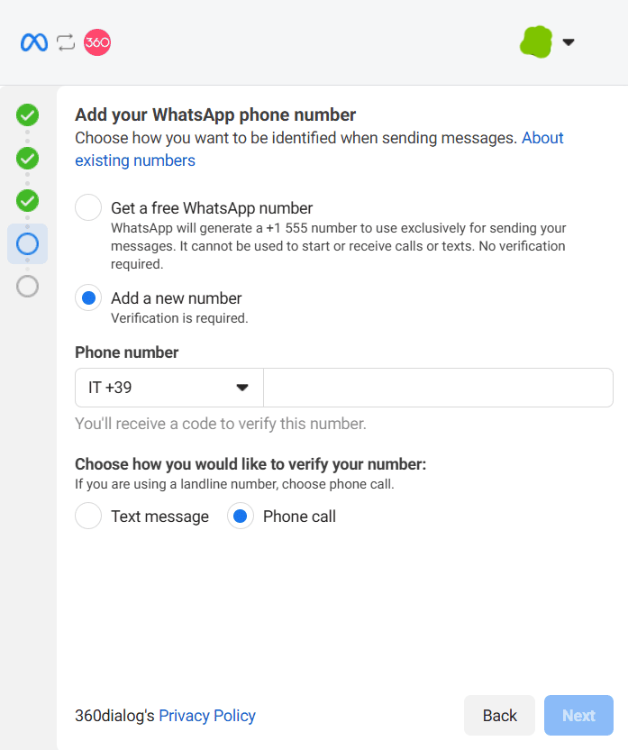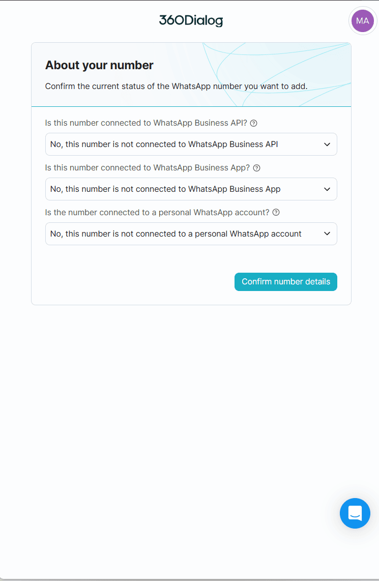 7. Dopo che hai creato il tuo account 360dialog, ti verrà chiesto di specificare se il numero inserito è connesso o meno ad un account WhatsApp Business API, a WhatsApp Business App oppure ad un account personale WhatsApp :
