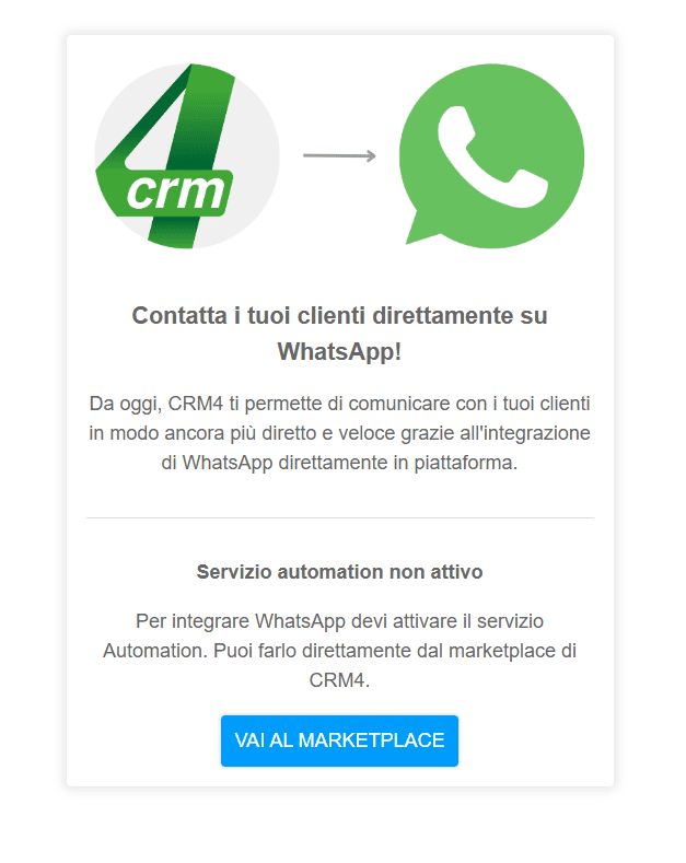 Assicurati che il servizio Automation sia attivo per utilizzare la funzione e di avere tutto il necessario per attivare l’integrazione con WhatsApp (clicca qui):