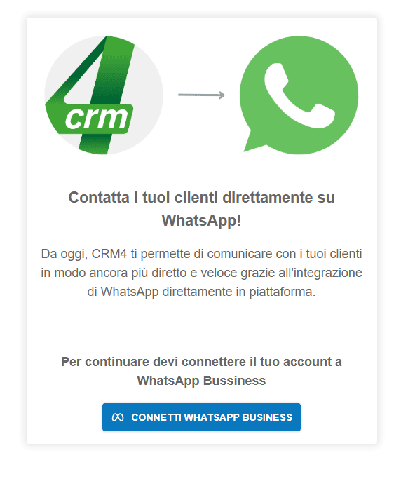 Ti diamo il benvenuto nella GUIDA per aiutarti a connettere il tuo account WhatsApp Business direttamente su crm4 e gestire i messaggi direttamente in piattaforma.