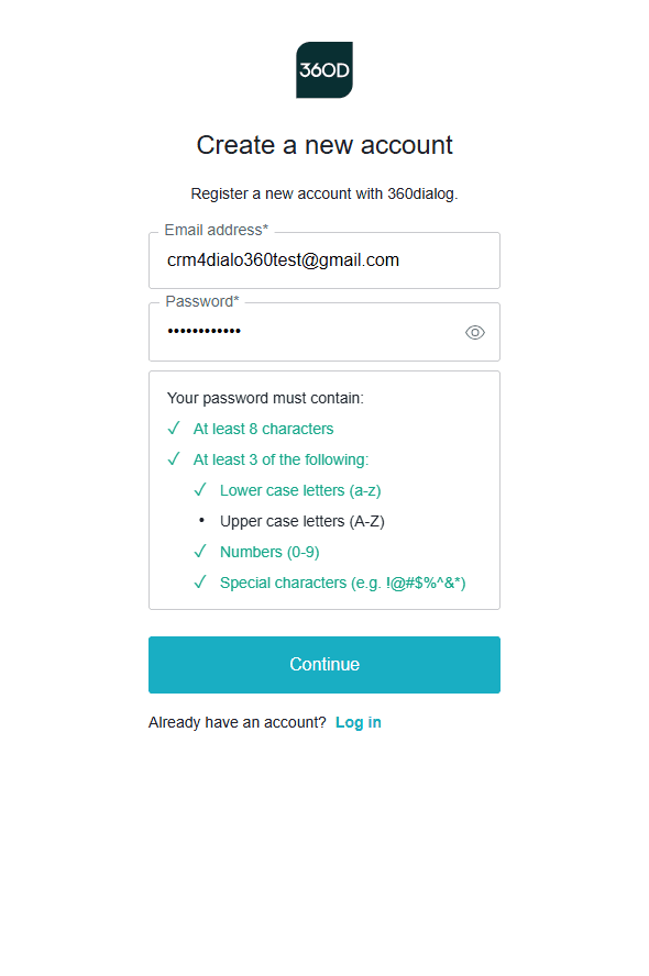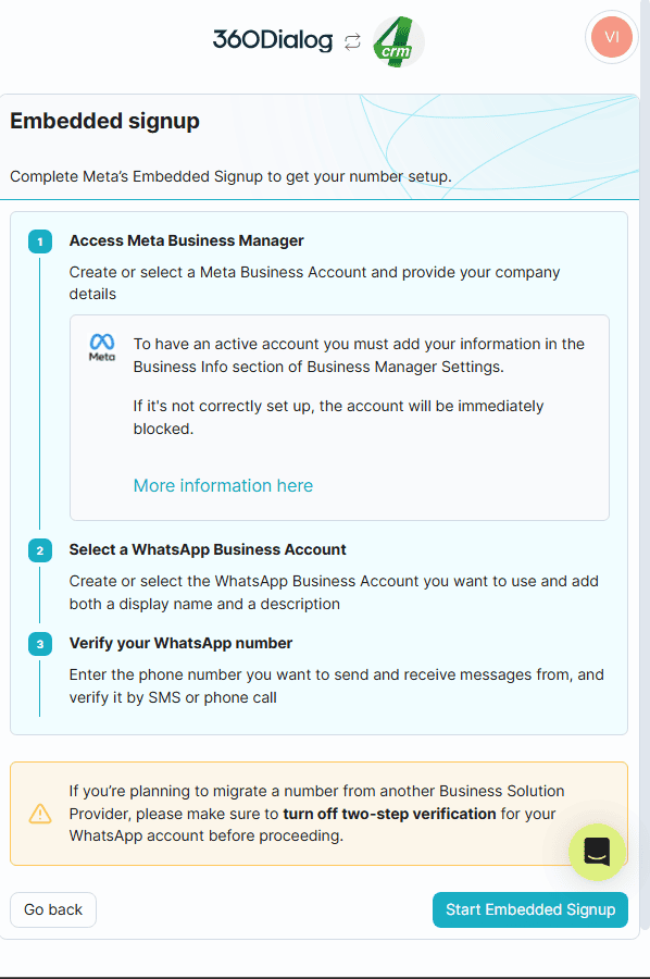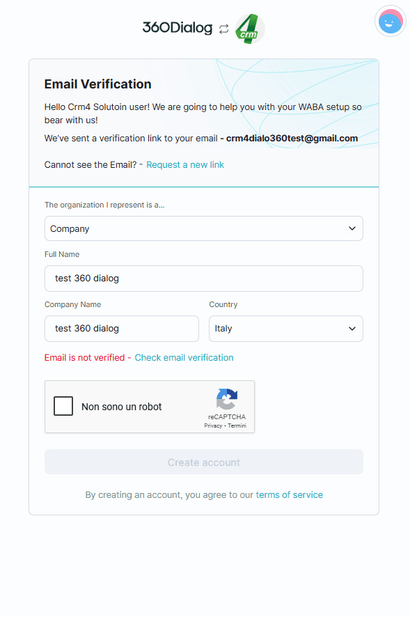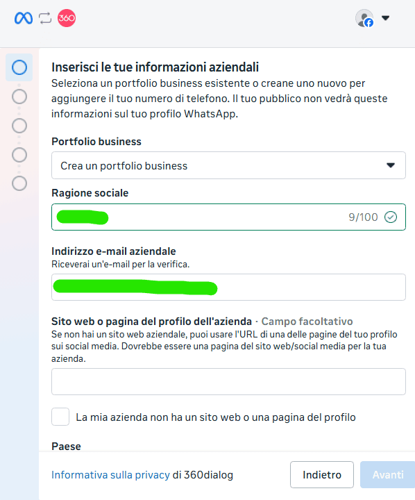 5. Si apre una nuova finestra del browser, nella quale ti verrà chiesto di registrare il tuo account 360dialog.