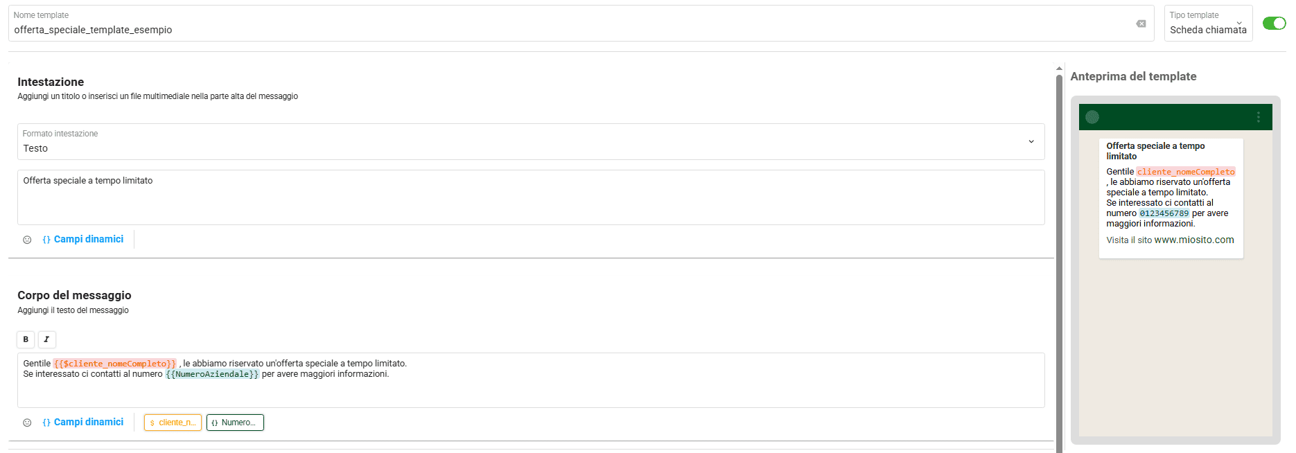Nota bene: tutti i campi dinamici, sia quelli automatici (cliente_nomeCompleto) sia quelli creati da te (azienda_telefono), possono essere modificati dall’operatore prima di inviare il template.