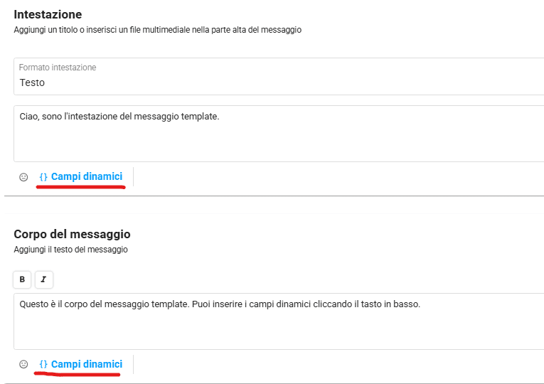 Nell’area Intestazione e Corpo del messaggio, puoi scegliere di inserire un Campo dinamico.